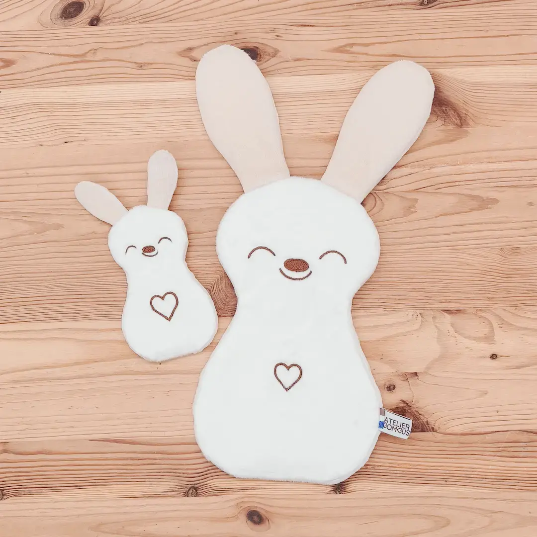 Paulin le Lapin est confectionné en minky blanc certifié Oeko-Tex® 100 classe 1, la plus stricte, celle dédiée aux bébés de moins de 36 mois, comme toutes les matières premières qui le composent. Le petit et le grand se fixent ensemble grâce à des aimants sécurisés, scellés à l’intérieur des doudous, inaccessibles aux enfants.